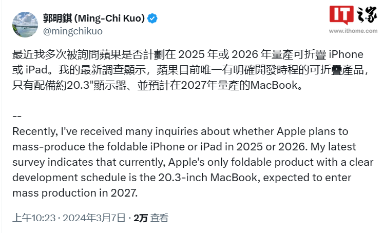 文章来源于互联网:凤凰网-郭明錤:苹果预计2027年量产20.3英寸折叠屏MacBook