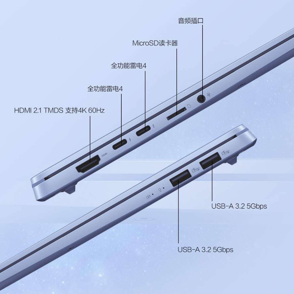 接口方面,该机拥有 2x USB 3.2 Gen 1 Type-A、2x 雷电 4、1x HDMI 2.1 TMDS、1x 3.5mm 二合一音频接口、Micro SD 读卡器。