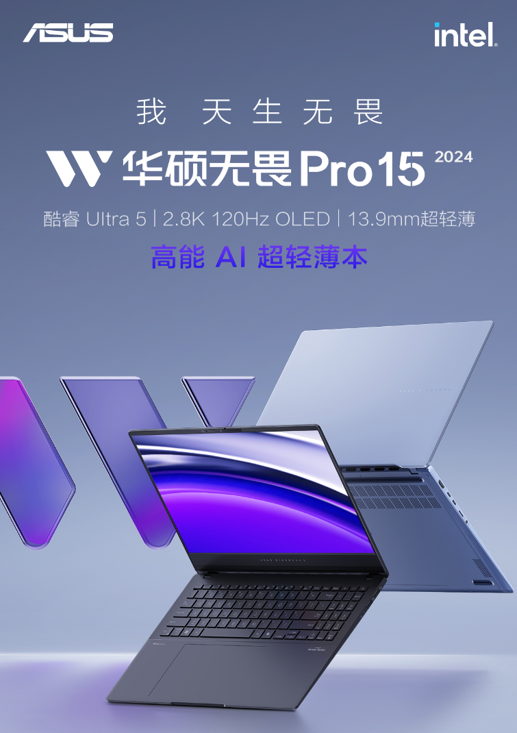 华硕无畏 Pro 15 笔记本核显版本可选酷睿 Ultra 5-125H 和 Ultra 7-155H 处理器,标配 32GB LPDDR5X 7467MHz 内存以及 1TB PCIe4.0 SSD;采用金属机身,厚度 13.9mm,重量约 1.5kg。