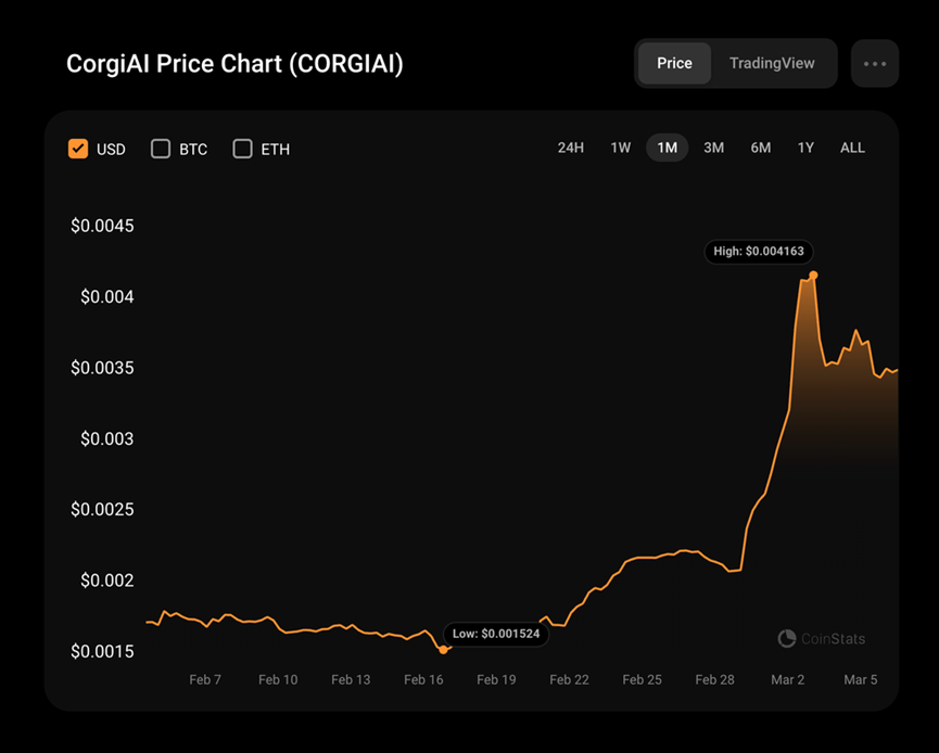 AI代币之所以看涨,是因为购买它们完全不需要脑力。 即将到来的零售投资者只需找到一些与人工智能相关的股票,在上面观看YouTube视频,然后按下购买按钮。这是曲线的左侧,CorgiAI投入前100名代币的原因之一。