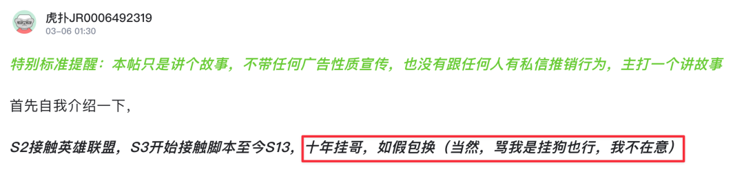 我在虎扑上刷到一位名叫 “ 虎扑 JR0006492319 ” 网友发的帖子,他自称十年挂哥,写了一篇 LOL 脚本长文科普。