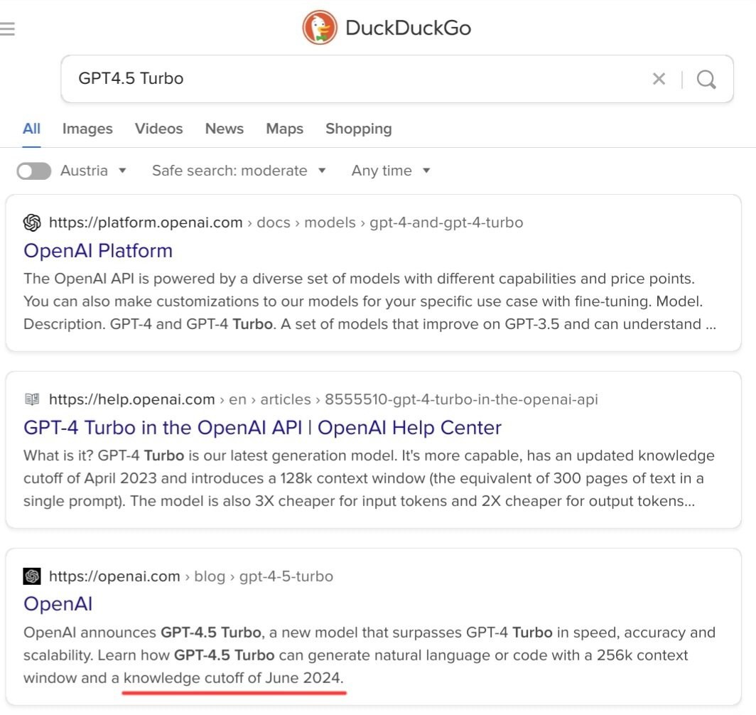 Bing和DuckDuck Go等搜索引擎在GPT-4.5 Turbo正式发布之前就已经对GPT-4.5 Turbo的产品页面建立了索引。
