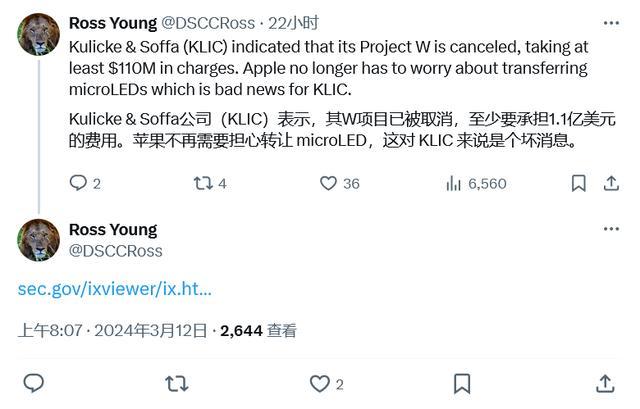罗斯・杨在推文中认为,这个“W 项目”就是苹果的 MicroLED Apple Watch Ultra 项目。文件显示由于客户取消该项目,预计将产生高达 1.3 亿美元的费用。