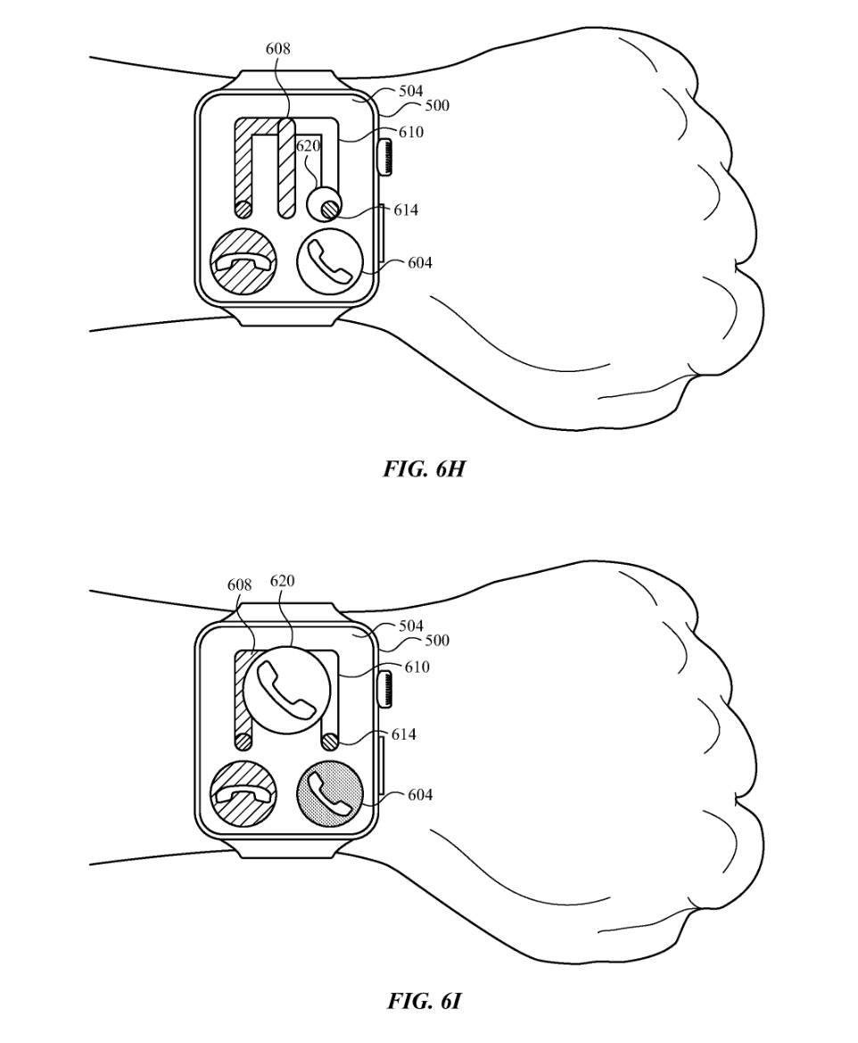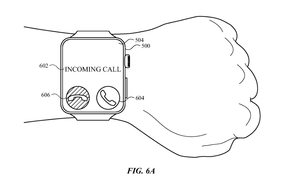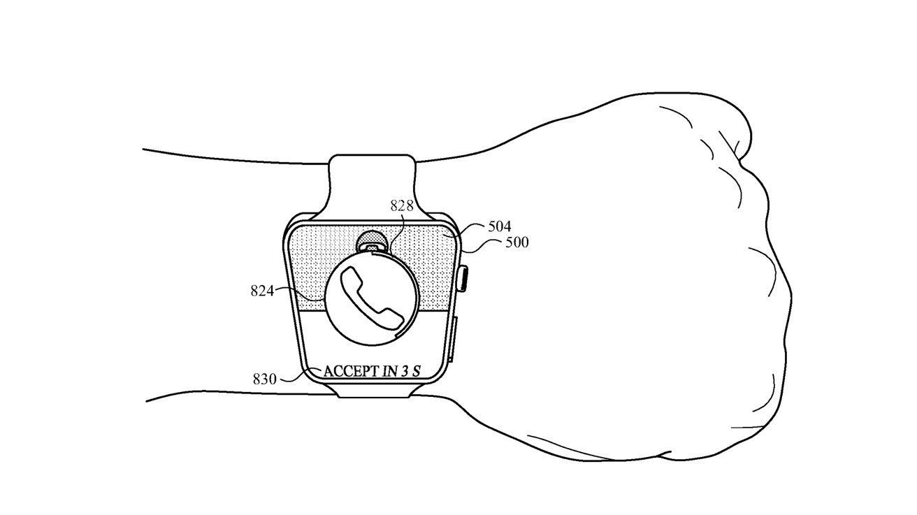 苹果在专利中另一个手势是握紧拳头,成为了许多新用户界面元素的核心。和“双指互点两下”手势类似,握紧拳头可以选择按钮或接受建议的文本回复。握紧拳头并旋转手腕,可以滚动浏览建议回复,或决定是接听电话还是将其发送到语音信箱。