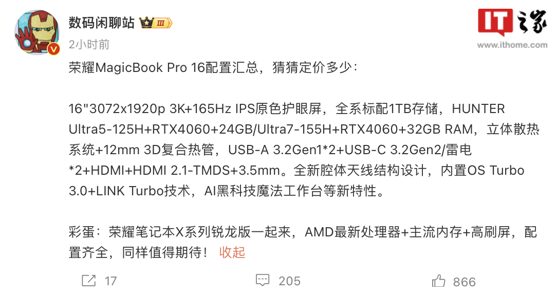 此外,博主提到该笔记本配备全新腔体天线结构设计,内置 OS Turbo 3.0+LINK Turbo 技术,AI 黑科技魔法工作台等新特。同时声称荣耀笔记本 X 系列锐龙版届时也将一起发布,搭载“AMD 最新处理器 + 主流内存 + 高刷屏”。