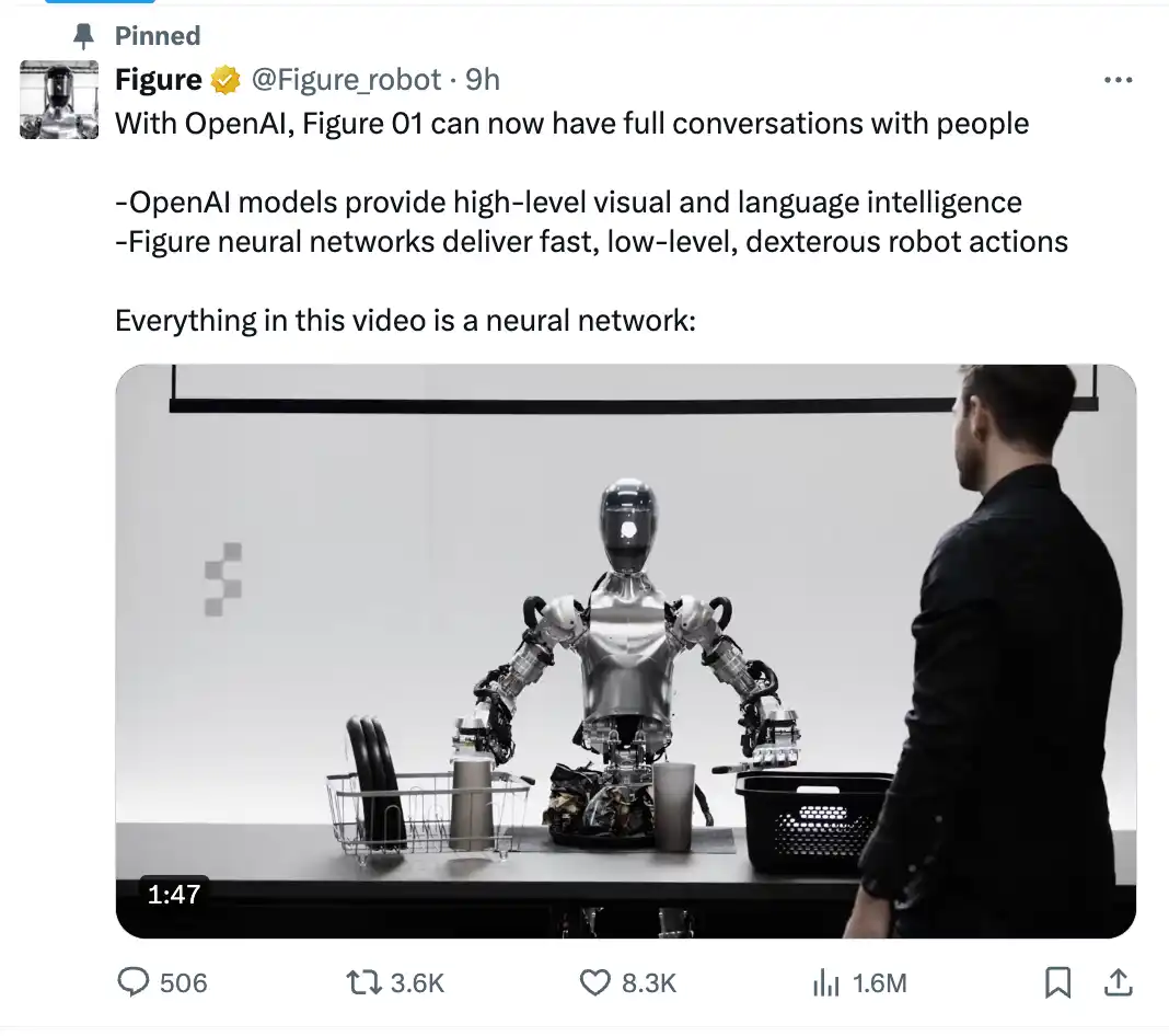 除了对话和视觉感知,Figure 01机器人还能够执行家务任务。当听到人类说“想吃东西”时,它能够迅速识别需求,并递过去苹果或其他食物。这一功能的实现,不仅展示了机器人在日常生活中的实用性,也进一步推动了人工智能与机器人技术的融合发展。