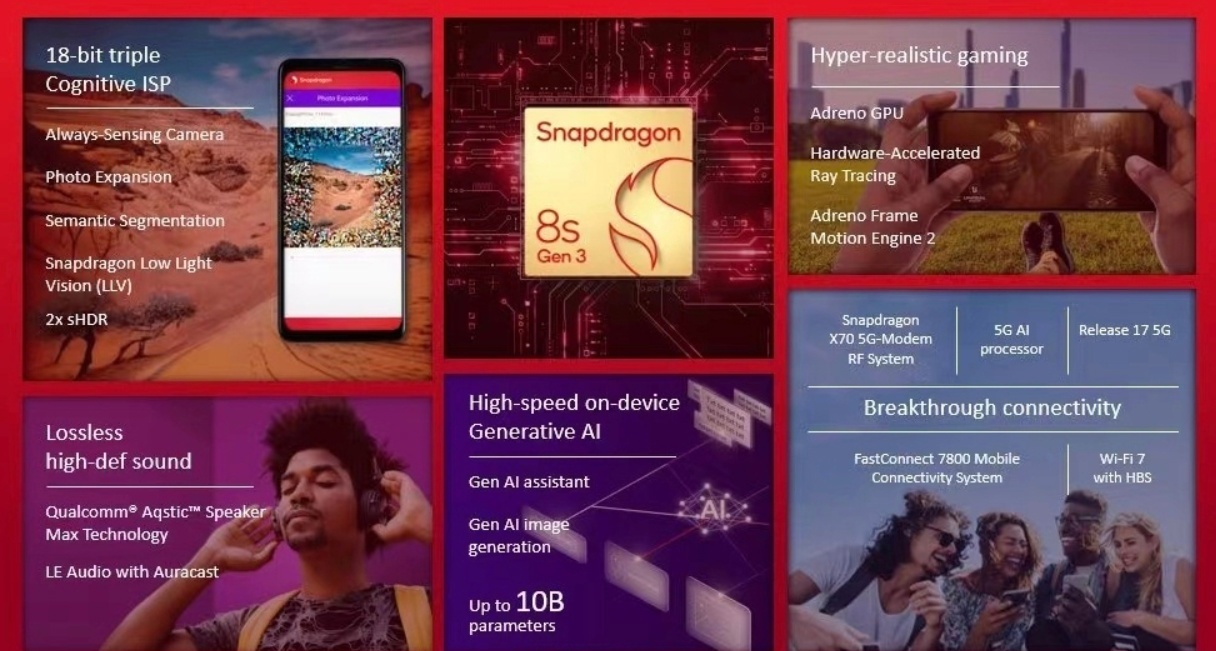 此外,该处理器还配备了高通 X70 5G 基带,支持 WiFi7、FastConnect 7800 移动连接系统、无损音频。近年大热的生成式 AI 技术也已经支持,并且有 10B 参数。