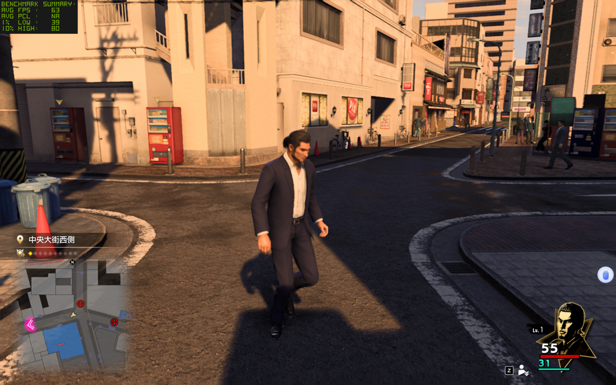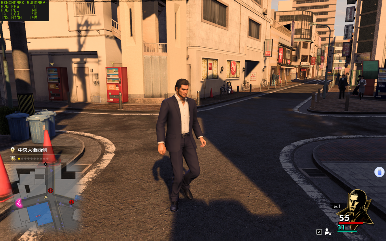 第五款也是发售时间不久的《如龙 8》,虽然场景多是箱庭,但依旧对硬件提出了较高的要求。游戏中支持了 AMD FSR 选项,实际表现上 FSR 对画面优化的效果还不够理想,开到高画质 / 极高画质预设,人物远景的脸部还是很糊。帧数方面,在 1200P 分辨率、高画质预设、FSR 画质优先的设置下,平均可以来到 71 帧,游戏流畅度不用担心。