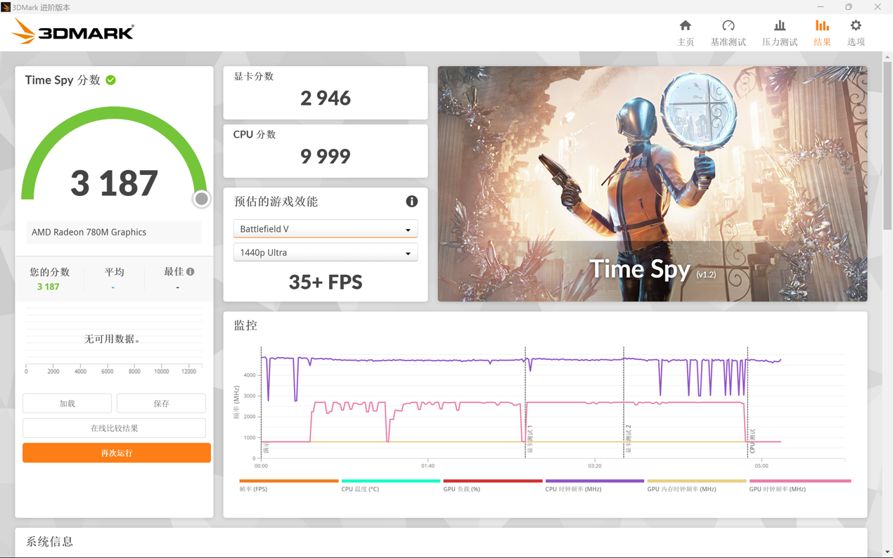 GPU 方面 AMD Radeon 780M 毕竟是核显,测试内容也简单一些。在代表 DX12 游戏性能的 3D Mark Time Spy 的基准测试中,小新 Pro14 2024 AI 锐龙版的显卡分数为 2946 分,物理分数为 9999 分。
