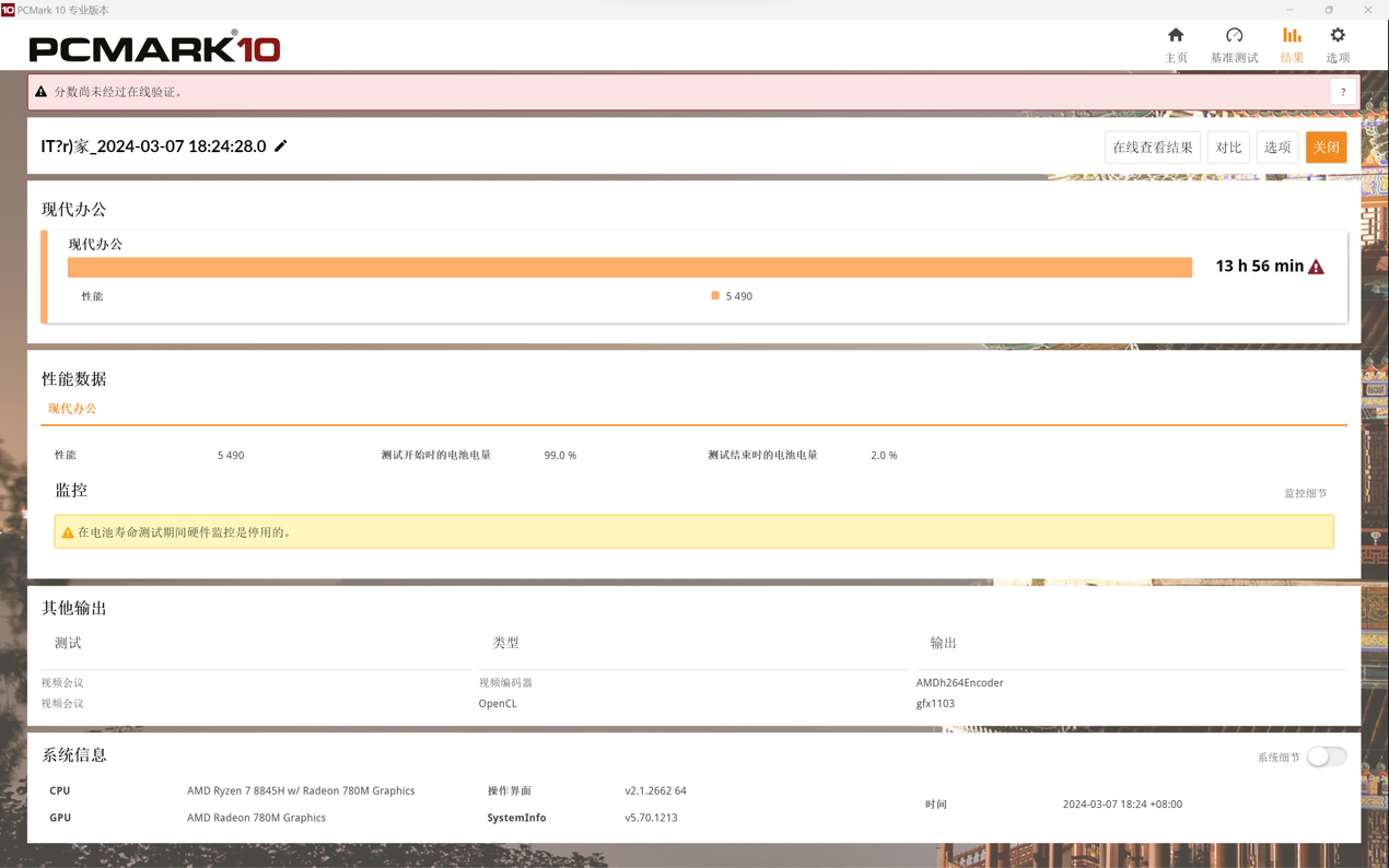不测不知道,一测吓一套,我们将小新 Pro14 2024 AI 锐龙版的屏幕亮度调到 150nit(约 65% 屏幕亮度),刷新率切换为 60Hz,性能模式选择节能,电池模式选择最佳能效,并关闭键盘背光,然后运行 PC Mark 10 中的现代办公续航测试项目,最终成绩为 13 小时 56 分,突破了之家的笔记本历史机型续航成绩。随后我们又用 1080P 分辨率播放一集 45 分钟的在线电视剧,也仅耗电 5%,续航表现非常出色。