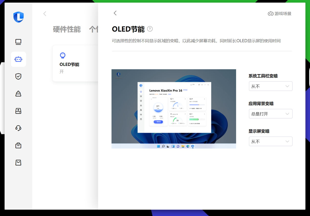 另外,联想小新 Pro14 2024 AI 锐龙版不仅提供了硬件级的防烧屏保护,还在系统管家中听了一个 OLED 节能模式,开启后可以选择将系统工具栏、应用背景和显示屏变暗处理,借助分区控制技术调节对应部分的屏幕亮度,从而进一步改善屏幕寿命和机器续航。联想官方也作出承诺,保修期内正常使用出现的非人为 OLED 屏幕显示问题,也会予以保修,让大家买得放心。