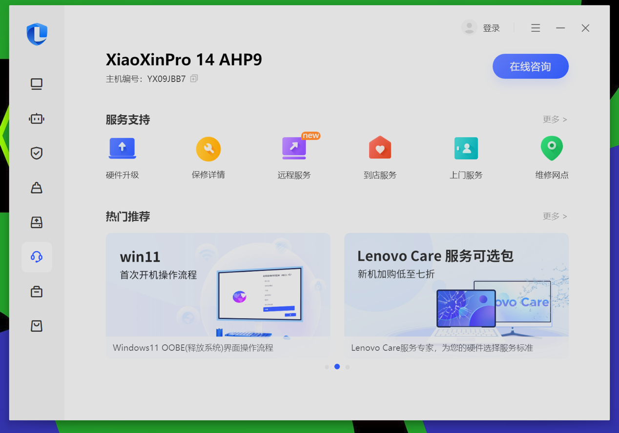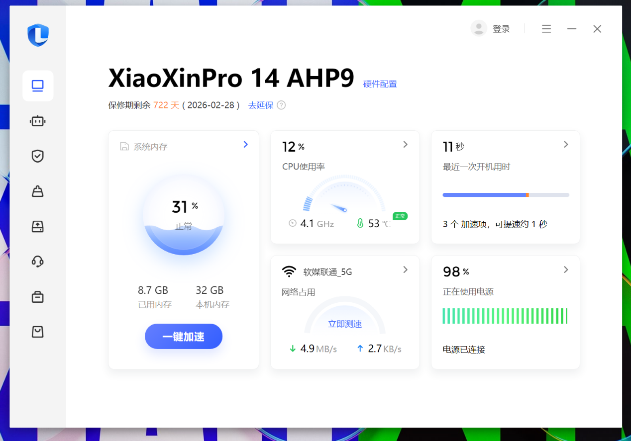 联想电脑管家中集成了很多实用功能,而且页面清新简洁,视觉上一目了然。主页可以查看电脑目前主要硬件的工作状态,产品保修状态等信息。