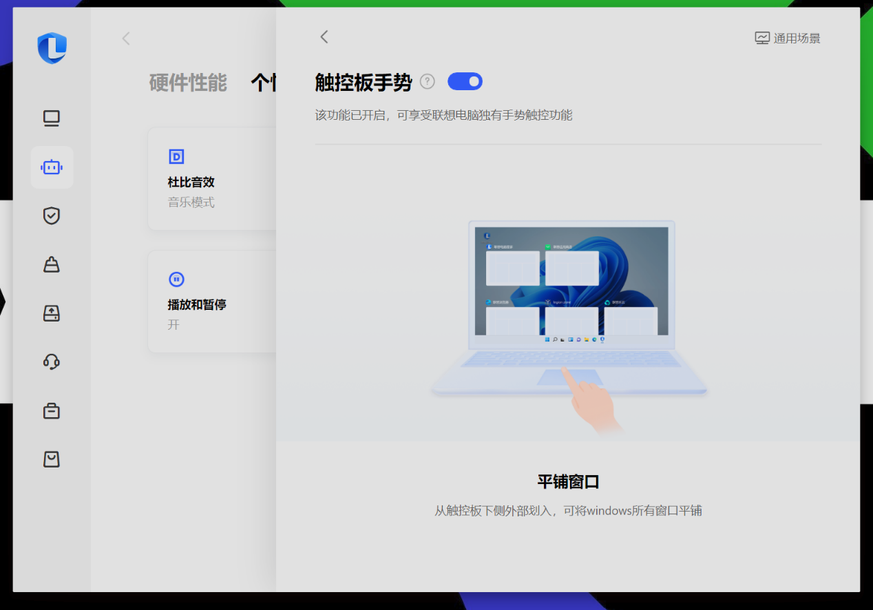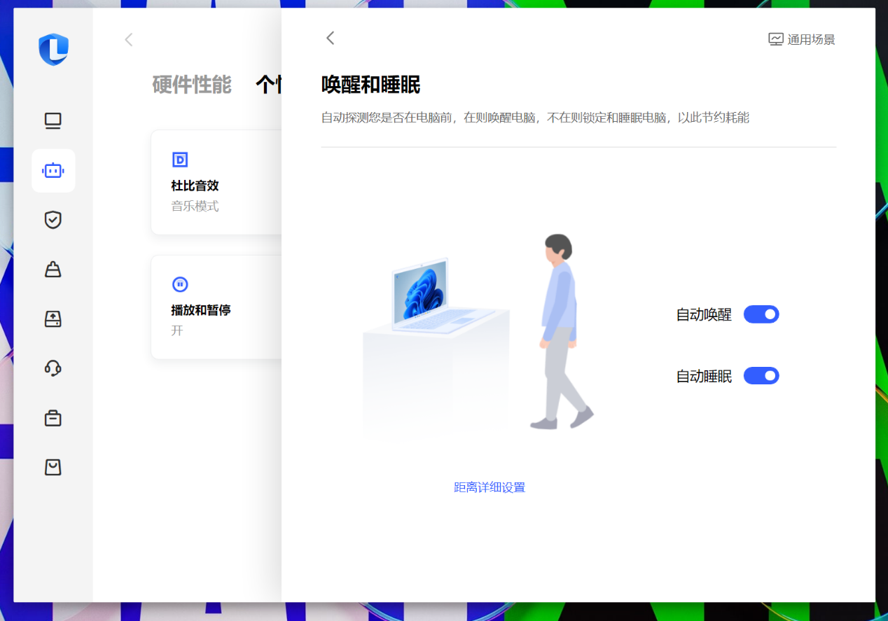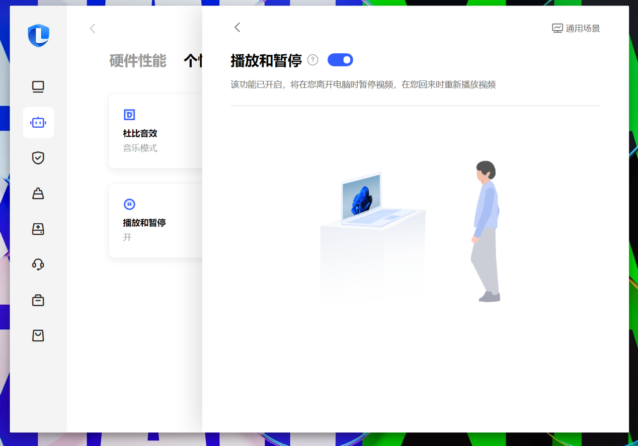 智能硬件管理标签页中不仅提供了智能场景检测和性能调节,也支持手动性能切换以及基于内置传感器的多种智能预测功能,比如判断用户是否在电脑前的自动唤醒 / 睡眠,在亮屏播放视频状态下自动暂停和播放视频的功能。