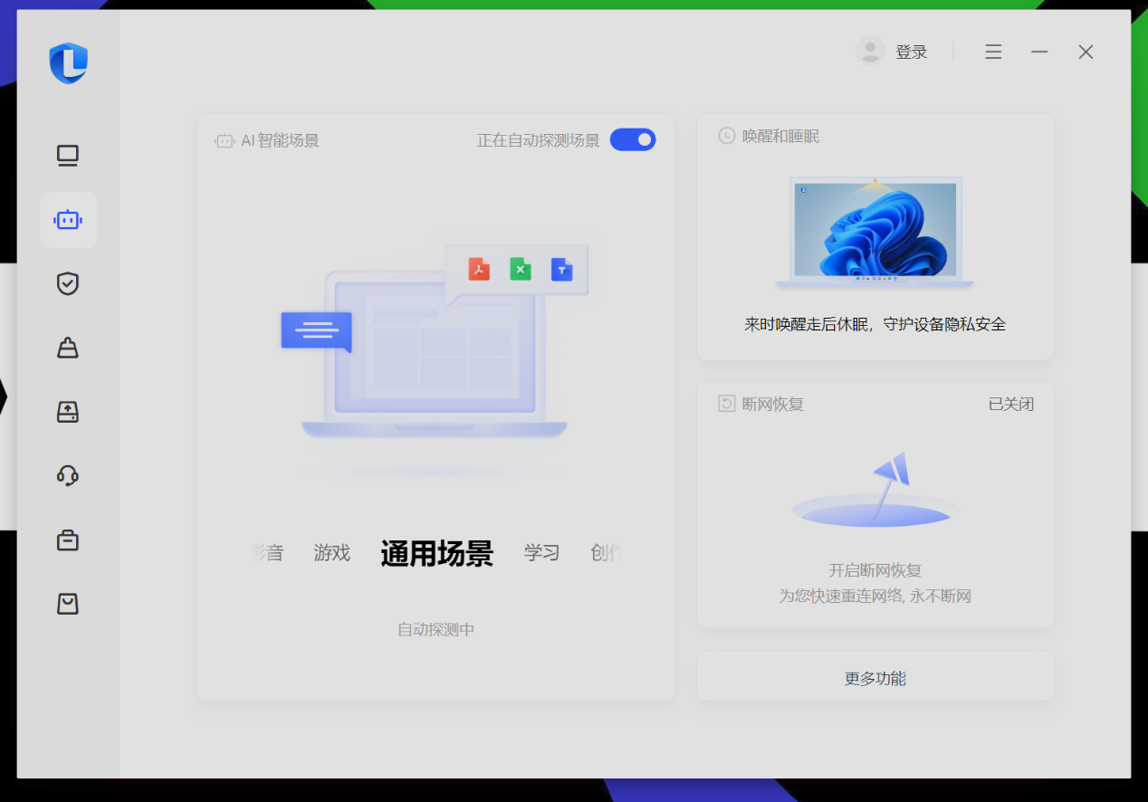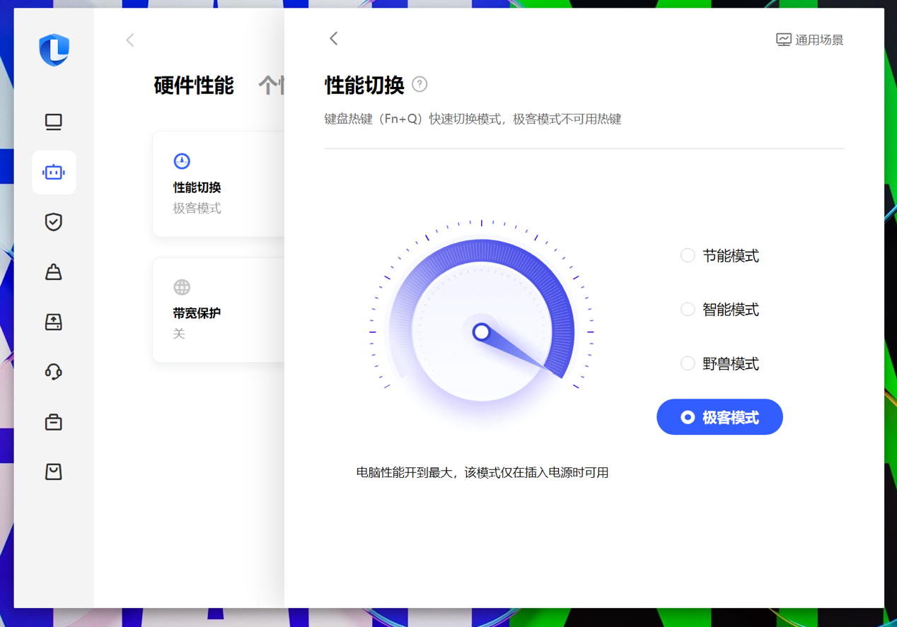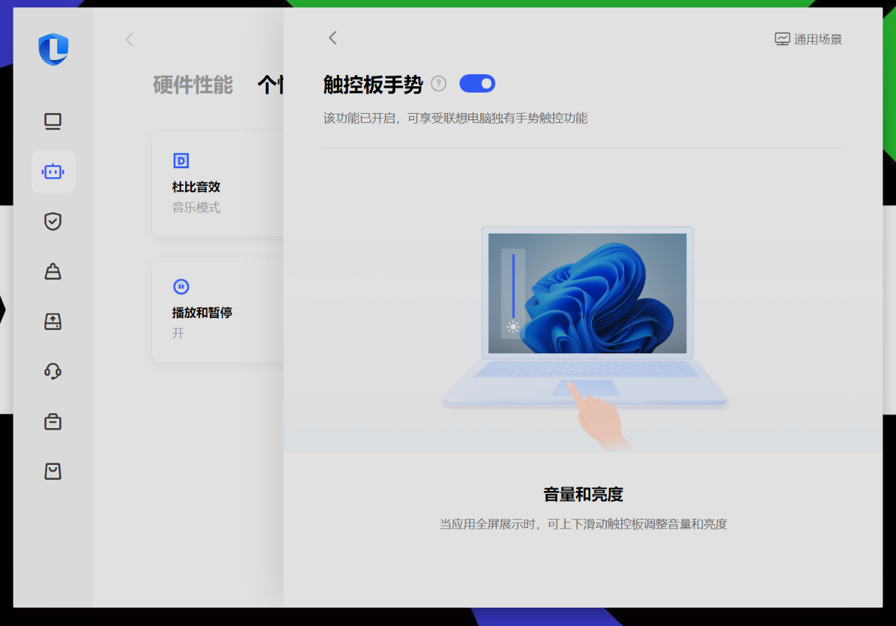 智能硬件管理标签页中不仅提供了智能场景检测和性能调节,也支持手动性能切换以及基于内置传感器的多种智能预测功能,比如判断用户是否在电脑前的自动唤醒 / 睡眠,在亮屏播放视频状态下自动暂停和播放视频的功能。