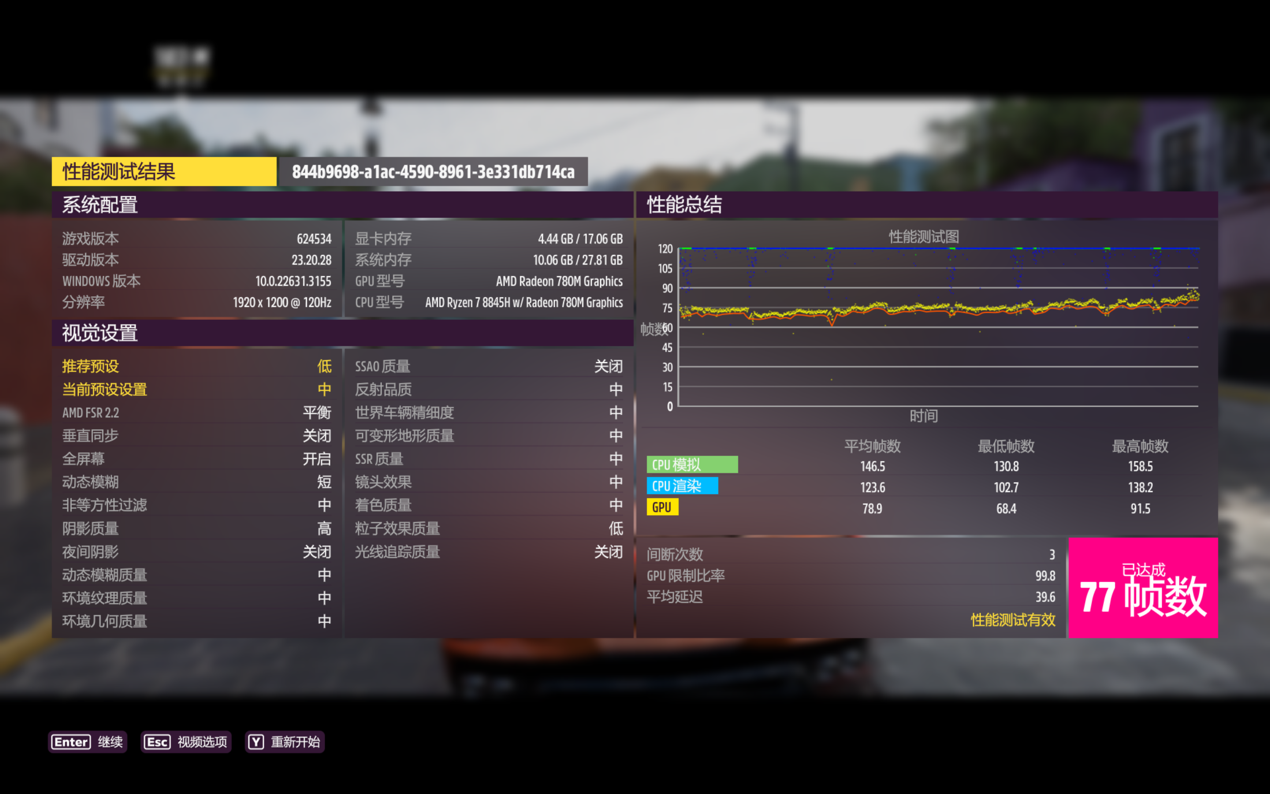 第三款是有着“神优化”之称的《极限竞速:地平线 5》,这款游戏针对 AMD 的 FSR 技术进行了适配,我们进入游戏后先选择 1200P 分辨率,中画质预设,并将 FSR 选项调节为平衡,运行自带基准测试,平均帧数可达 77 帧,运行起来还是很流畅的。