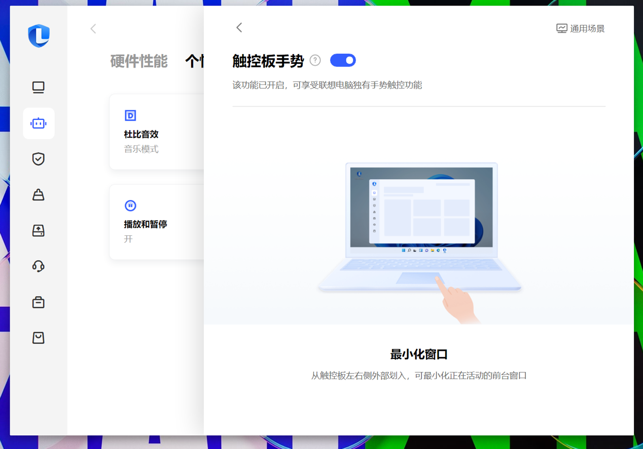 触控板还支持联想独家快捷触控手势,比如左右两侧向内划动可以最小化窗口、全屏应用状态下沿两侧上下划动进行音量调节,底部上划平铺窗口等,适应之后还是很方便的。