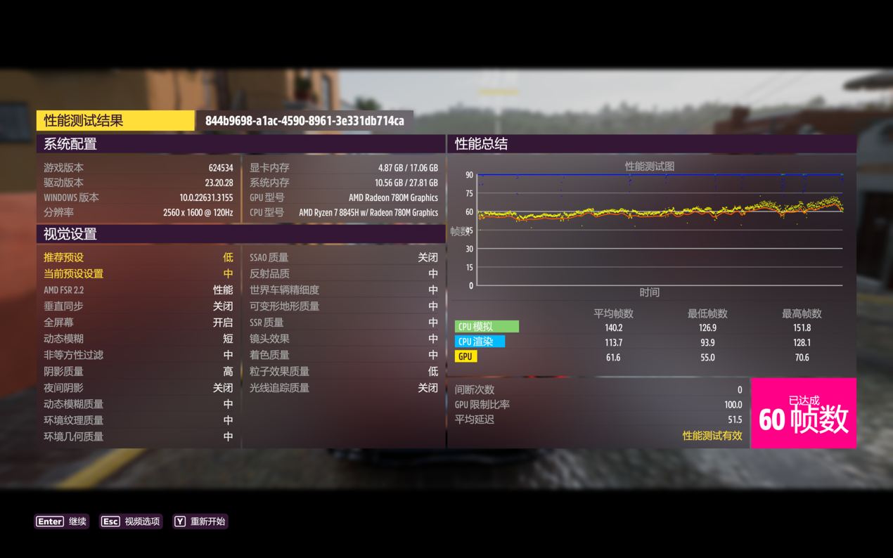 接着我们将分辨率改为 1600P,FSR 选项改为性能,此时的平均帧数刚好跑在 60 帧,可以说 Radeon 780M 想要畅玩还是没太大压力的。