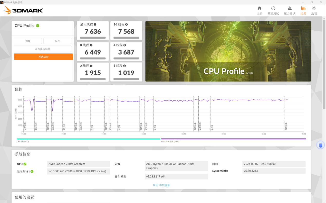 我们也测试了 3D Mark 的 CPU Profile 项目,它能够更直观地反映出 CPU 的多线程性能表现,小新 Pro14 2024 AI 锐龙版的 CPU 单线程分数达到了 1019 分,最大线程分数来到了 7636 分,相比之前测过的同款处理器游戏本,最大线程分数要更高一些。