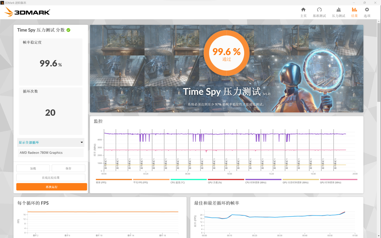 当然,3D Mark 的 Time Spy 压力测试也是必测项目,一般要求其成绩高于 97% 才算通过测试,表现合格。小新 Pro14 2024 AI 锐龙版的 20 轮 Time Spy 循环最终成绩为 99.6%,轻松通过了测试。