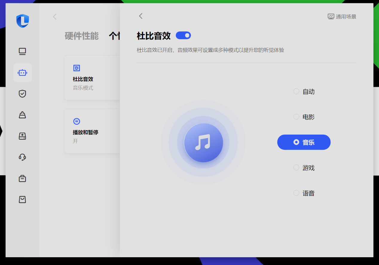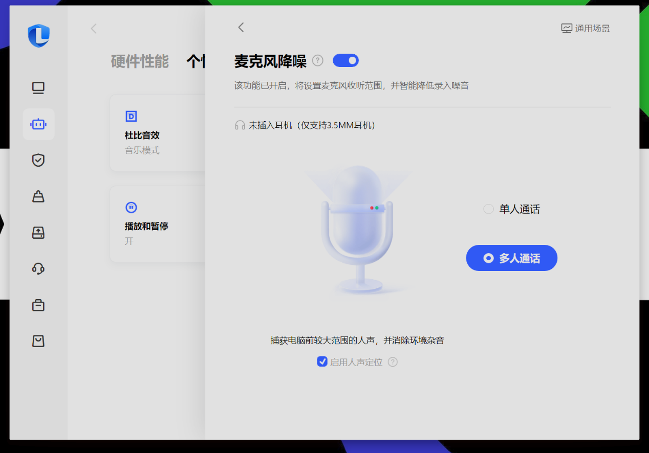 杜比音效功能会根据选择的应用场景,智能优化声音表现。麦克风降噪则可以在插入耳机的情况下自动检测人声和位置,强化人声表现,消除环境噪音。