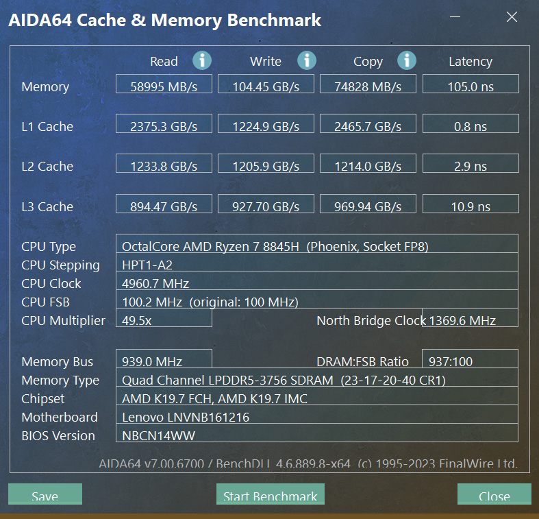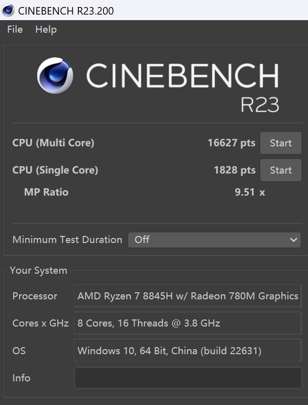 而在 CineBench R23 的测试中,锐龙 7 8845H 的单核成绩突破了 1800 分,多核成绩则为 16627 分,这个表现已经击败一些搭载同款处理器的 24 年新款游戏本,真是机不可貌相。