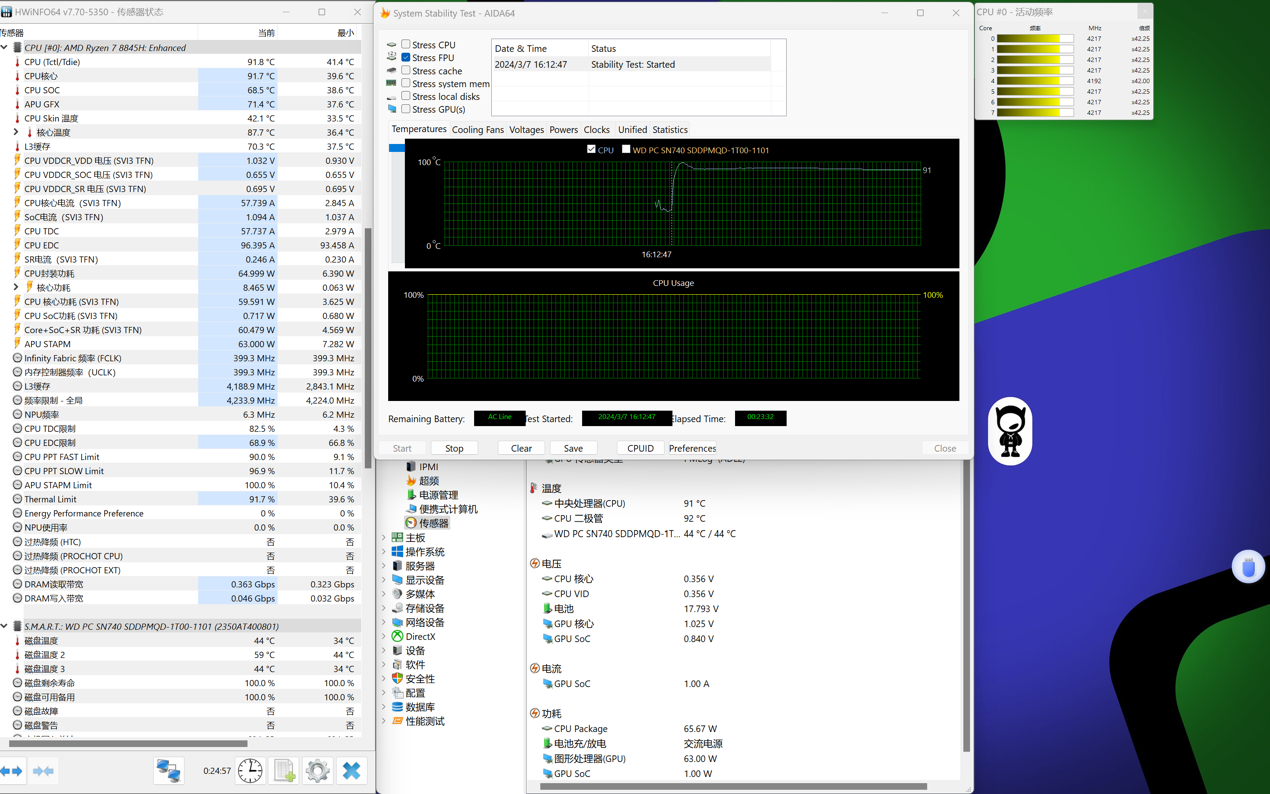 看看上面这张烤机实测就知道原因了,在 20 分钟的 AIDA64 单烤 FPU 测试中,小新 Pro14 2024 AI 锐龙版的 CPU 功耗可以保持在 65W,虽然 CPU 温度略微高了一点,来到了 91 度,但这毕竟是一台轻薄本,而且 CPU 此时的主频也高达 4.2GHz,相比烤机时 54W 功耗释放,CPU 主频保持在 4.0GHz 的游戏本,自然表现要更加出色。