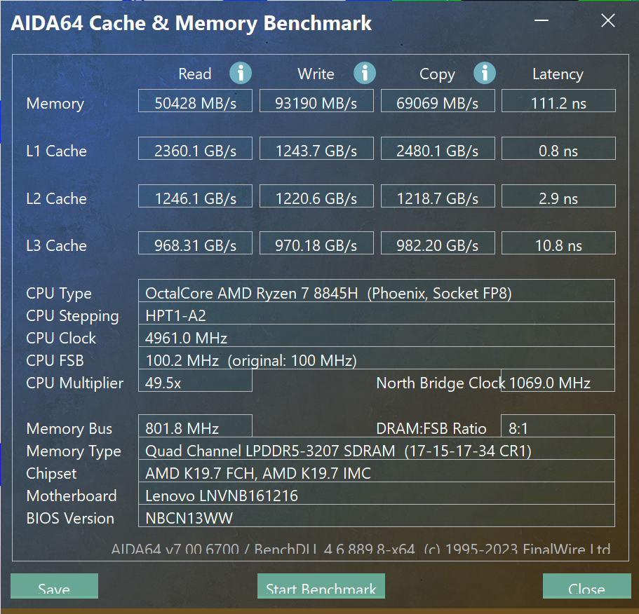 游戏测试中我们也注意到,3A 游戏对于内存占用还是比较高的,基本都要用掉 16GB 以上,所以小新 Pro14 2024 新品普及了 32GB 大内存和 1TB 存储容量,对游戏体验来说非常关键。在内存的表现上,读取分数稍低一些,可以跑到 50428MB/s,而写入和拷贝分数分别达到了 9W + 和 6W+,延迟稍高,在 111.2ns。