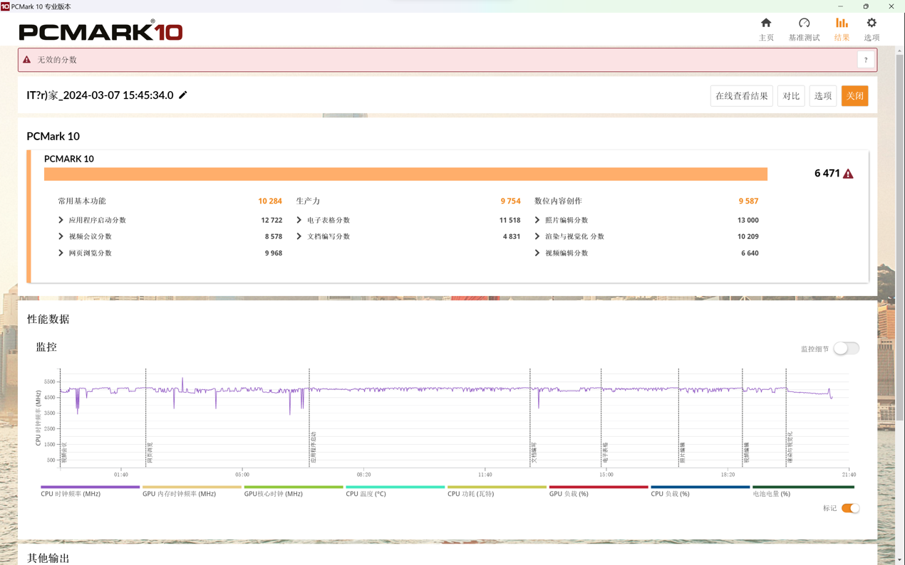在 PC Mark 10 现代办公基准测试中,小新 Pro14 2024 AI 锐龙版的综合分数为 6471 分,三个子项分数的表现基本都在 1 万分左右,表现比较均衡,得益于核显性能的强大,数位内容创作项目中的照片编辑和渲染与视觉化分数分别有 13000 分、10209 分。
