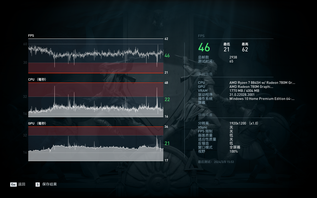 第二款是玩家俗称“众生平等”的《刺客信条:奥德赛》,它对硬件的压力有多大相信老玩家心里都有数,而且没有针对 AMD FSR 技术做优化,进入游戏后我们选择 1200P 分辨率,低画质预设,运行游戏自带的基准测试,平均帧数来到了 46 帧,表现还可以。