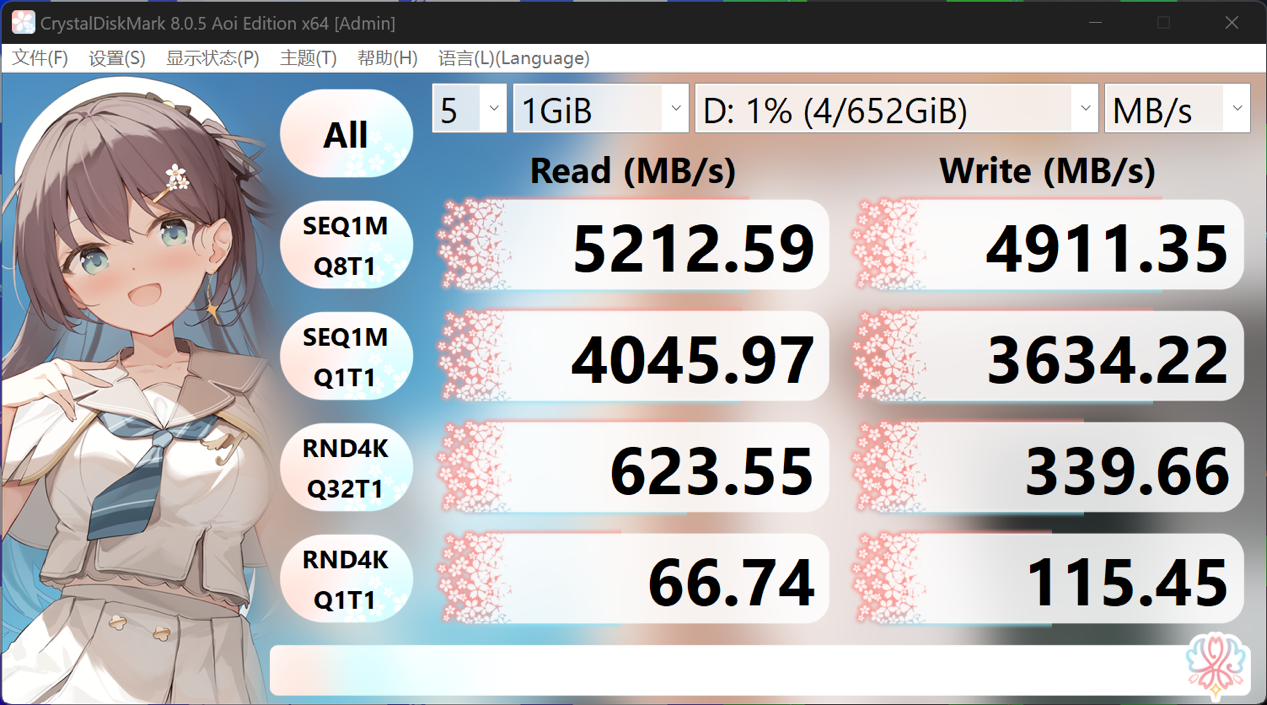 自带 1TB 固态硬盘方面的表现中规中矩,顺序读写均在 5000MB/s左右,具体表现大家可以参考 CrystalDiskMark 的测试结果。