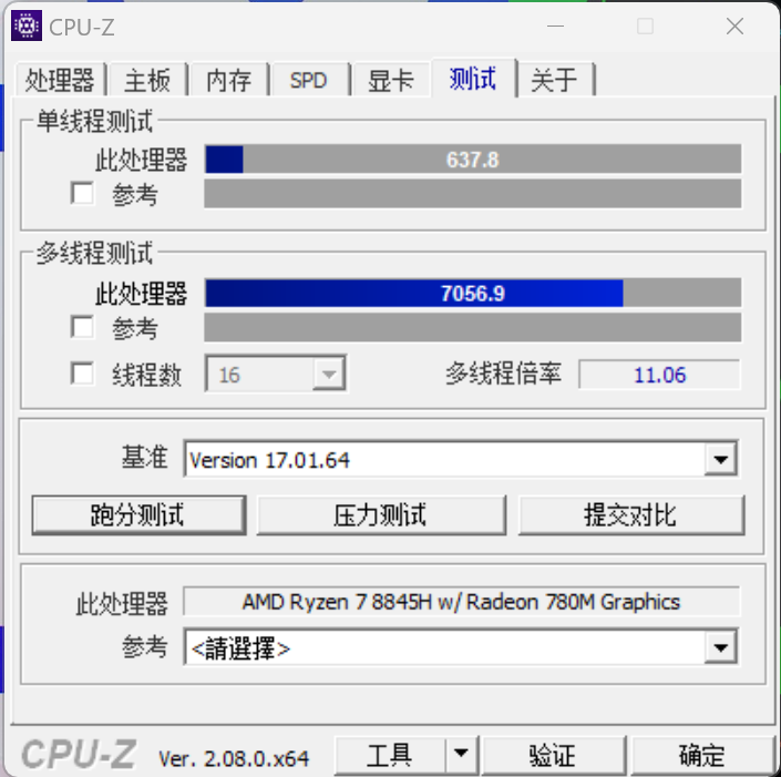 在 CPU-Z 自带的跑分基准测试中,锐龙 7 8845H 的多线程分数跑上了 7000+,单线程分数也有 640 分左右。