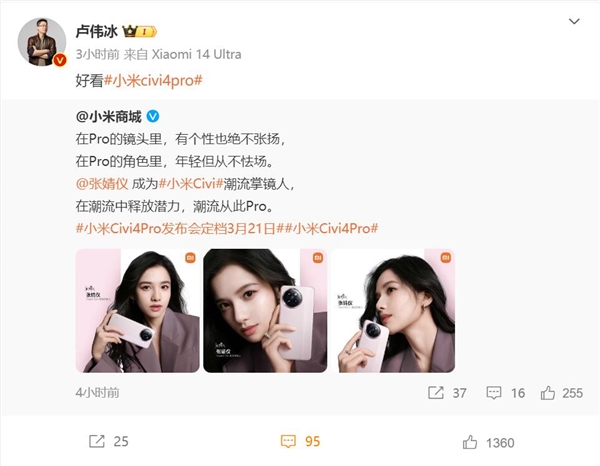 文章来源于互联网:快科技-张婧仪与小米Civi 4 Pro同框 网友点赞:好看 小米找对人了