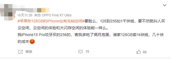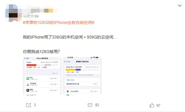 有网友和博主表示,“我的iPhone用了338G的本机空间+939G的云空间…你跟我说128G够用?”“要不是我自己在用我就真的信了”“要脸么,128到256加1千块钱,要不然就叫人买云空间,云空间的体验和大闪存空间的体验能一样么。”等等。