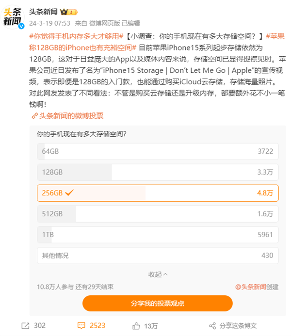 根据媒体投票,截稿前,共有10.8万人参与投票,选择256GB的有4.8万人,128GB有3.3万人,1TB为5961人。