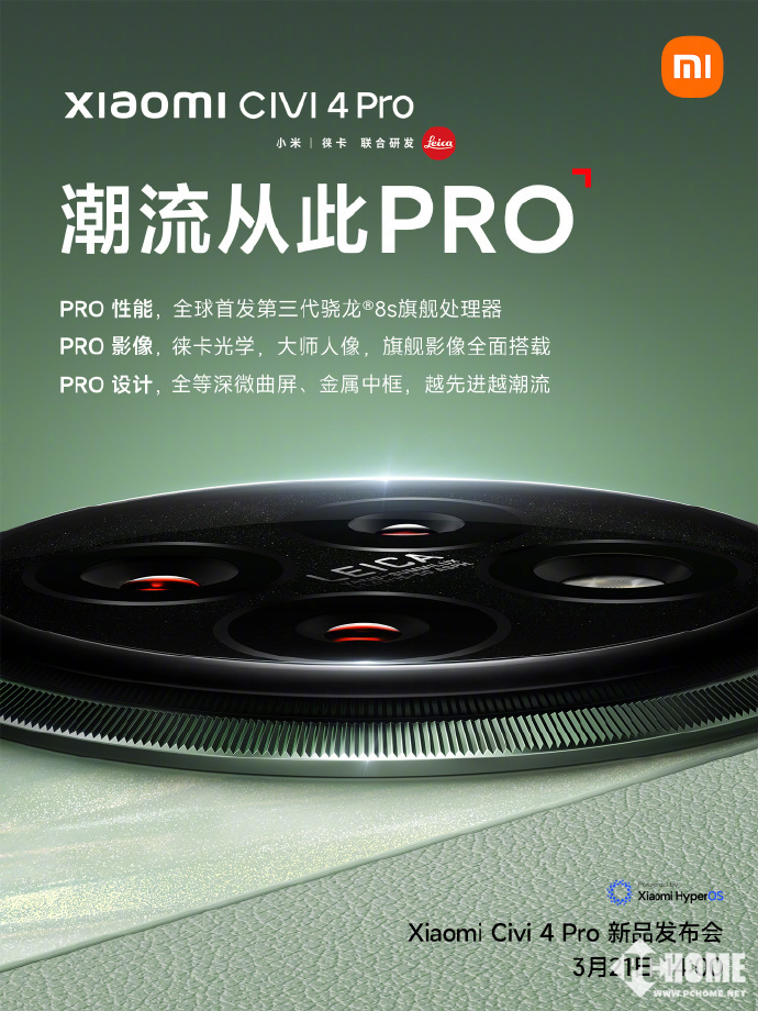 小米手机官微发布消息称,小米Civi 4 Pro定档3月21日14:00正式发布,性能Pro、影像Pro、设计Pro,以颠覆行业的跨越式成长,开启“潮流旗舰”的全新篇章。