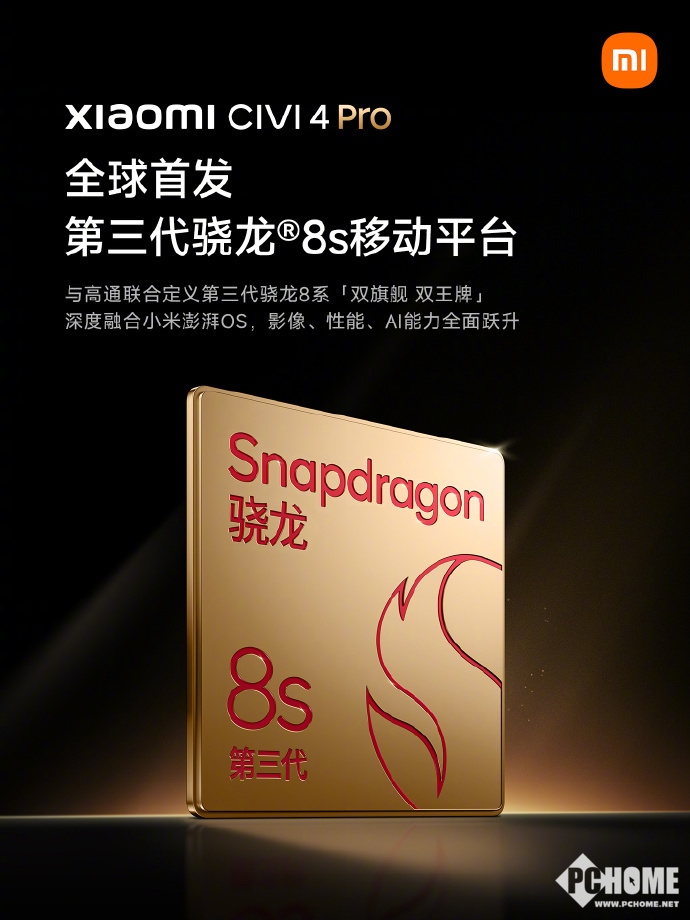 宣传海报显示,小米Civi 4 Pro将全球首发第三代骁龙8s旗舰处理器,该处理器采用台积电4nm工艺,第三代骁龙8相同CPU架构,拥有主频3.0GHz的超级内核、4个主频2.8GHz性能内核和3个主频2.0GHz的效率内核。