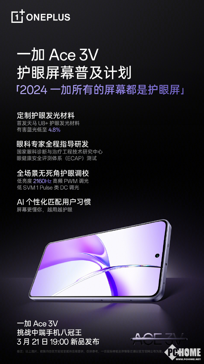 一加Ace 3V四大维度,技术攻坚,把旗舰级护眼屏幕普及到底,首发定制护眼发光材料;眼科专家全程指导研发;全场景无死角护眼调校;AI个性化匹配用户用屏习惯。