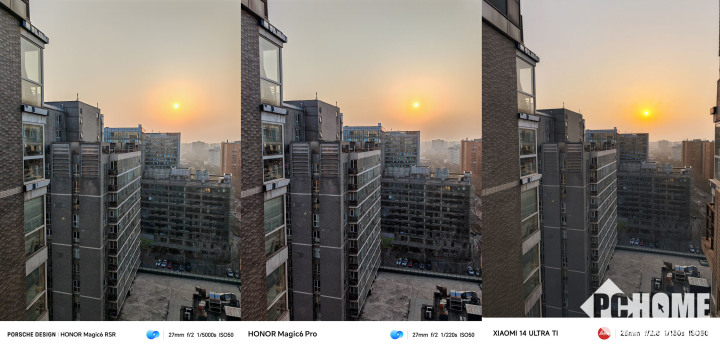 日落是个典型的需要高动态支持的场景,三款手机的表现其实都不错,太阳部分的高光压制表现优秀,建筑物表面纹理清晰不黑,整个画面没有明显的暗部区域。简而言之就是亮的地方压得住,还能保持画面的整体清晰度。三款手机的区别更多的是在颜色方面,荣耀Magic RSR色彩比较准,两位两部手机偏暖。