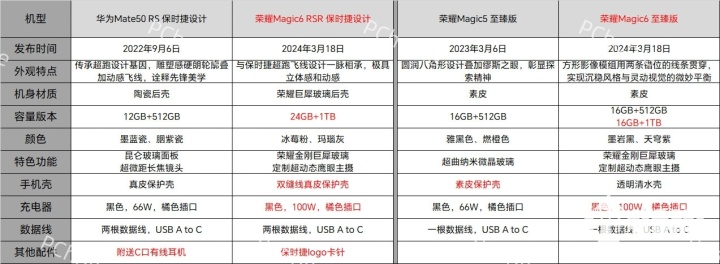 我们再来看一下大家比较关心的一些数据对比,荣耀的保时捷设计相比华为,可以说是全方面的对标,每一项单拉出来都毫不逊色。包装中附赠的配件上,荣耀提供的双缝线真皮保护壳,肯定能够让我们在巨犀玻璃外壳之外,享受到不同的质感呈现。荣耀Magic6 至臻版则提供了一个透明清水保护壳,这或许也是荣耀品质的一种体验,毕竟在金刚巨犀玻璃的加持之下,保护壳和贴膜都不止必须品。