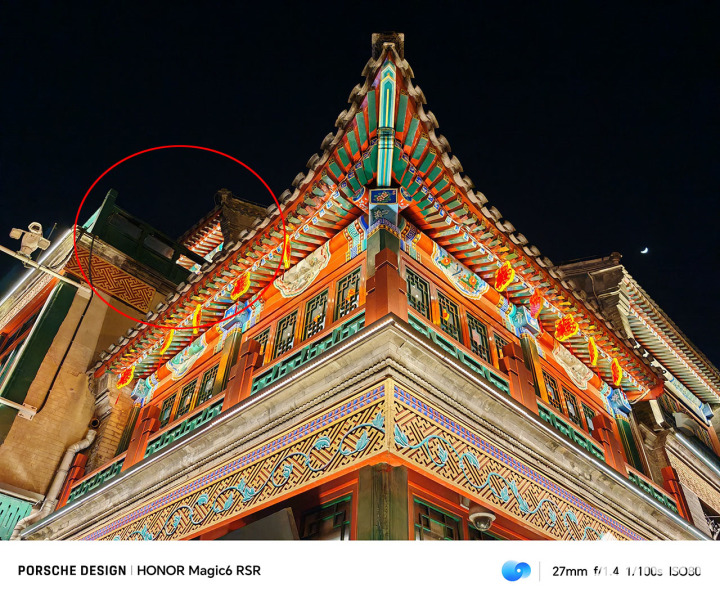 在这组样张中,两部荣耀的画面亮度高,甚至连续的灯带也没有过曝情况,实际效果都非常好。从拍照参数来看,荣耀Magic6 RSR具备更低的快门时间,可以更快速度的成像,这其中显然也有新传感器的功劳,它可以用更少的照片完成合成,而这对暗光拍照的作用是很大的,安全快门更长也意味着成片率高。在暗部区域的表现力上,荣耀Magic6 RSR要比荣耀Magic6 Pro更亮一些,建筑护栏部分细节保留更好。作为对比的小米,存在细节丢失问题,画面整体亮度不太够。