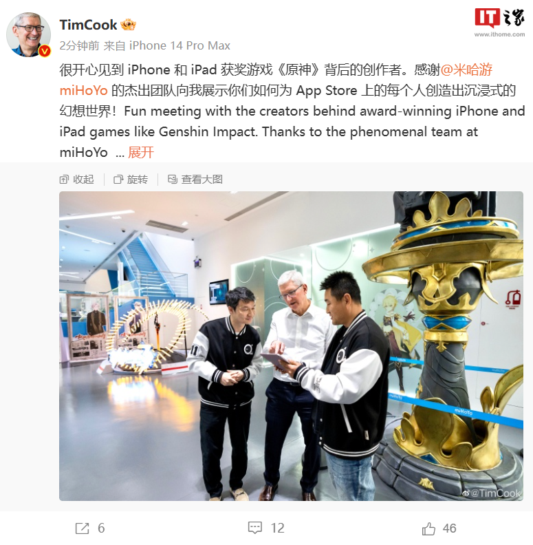 据IT之家此前报道,库克去年 3 月来到上海,还到访了《原神》开发商米哈游的总部,《原神》曾获得 2020 年苹果 App Store 年度精选应用和游戏中的“年度 iPhone 游戏”,这也是中国开发者首次获得苹果年度精选 App 奖项。