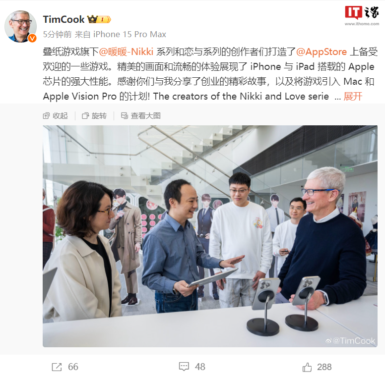 随后,库克发文透露来到叠纸游戏公司。该公司打造了暖暖系列和恋与系列游戏,包括大家熟知的《闪耀暖暖》《恋与制作人》等,因此也是苹果 App Store 中的一大游戏开发商。