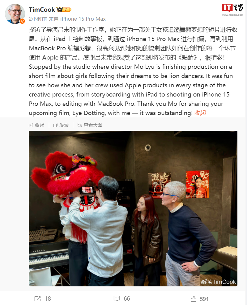 此外,库克探访了导演吕末的制作工作室,她正在为一部关于女孩追逐舞狮梦想的短片进行收尾。从在 iPad 上绘制故事板,到通过 iPhone 15 Pro Max 进行拍摄,再到利用 MacBook Pro 编辑剪辑,吕末带库克观赏了这部即将发布的《點睛》。