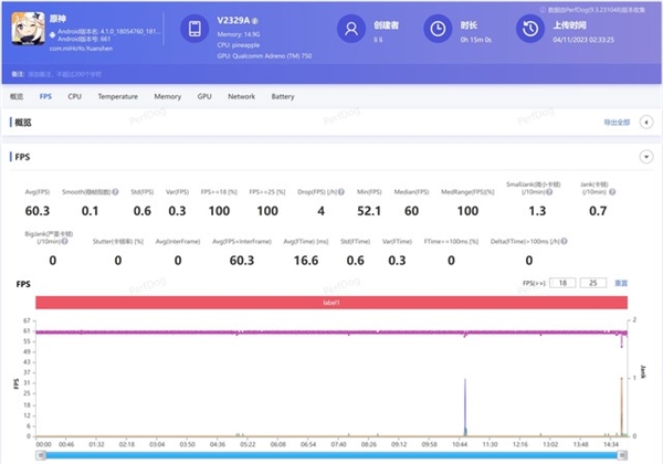 无论性能如何,作为玩家更关心的还是在实际游戏场景中的表现。在《原神》(60帧+极致画质)15分钟测试中,iQOO 12 Pro的表现相当稳定,可以全程稳定在60帧。