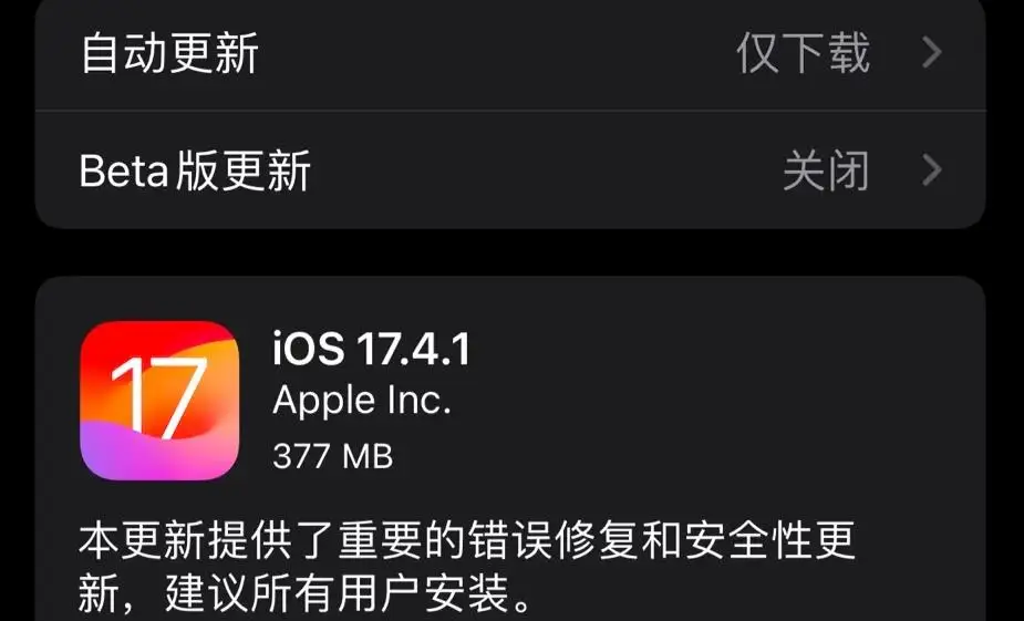 文章来源于互联网:科技讯-苹果Apple iOS 17.4.1更新正式发布:强化安全与错误修复