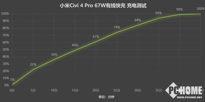 小米Civi 4 Pro在轻薄的机身内置了4700mAh的电池,并且支持67W快充,将手机电量消耗至1%,实测15分钟就能将手机充至49%、44分钟可以将手机充满。并且小米Civi 4 Pro支持1600次长循环,1600次完整循环后,电池容量≥80%,电池更加耐用。如果不打游戏,日常追追剧、拍拍照还是可以满足一天一充的。