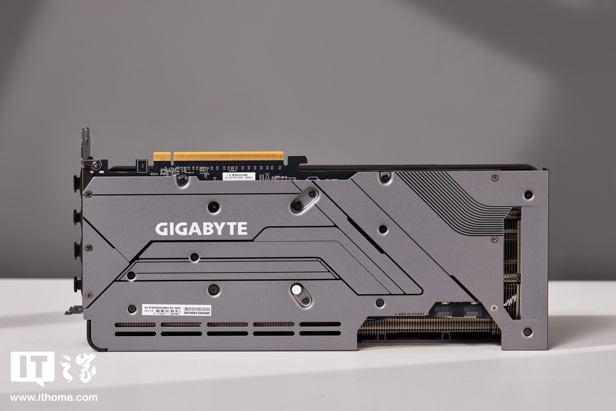 背板方面,技嘉 7900 GRE 魔鹰显卡采用银灰色铝合金材质,可以更好保护显卡的 PCB,表面印有一些黑色的硬核风纹理装饰,右侧没有采用主流的单个大面积进气口,而是在下方和右侧开了三组不同大小形状的开口帮助气流循环。