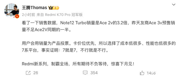 Redmi品牌总经理、Redmi品牌发言人王腾在谁叫媒体发文称,“Note12 Turbo销量是Ace 2v的3.2倍,昨天友商Ace 3v预售销量不足Ace2V同期的一半。”