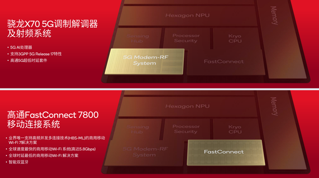 这颗芯片搭载的调制解调器及射频系统,也就是我们俗称的 “ 基带 ”,是骁龙 X70。