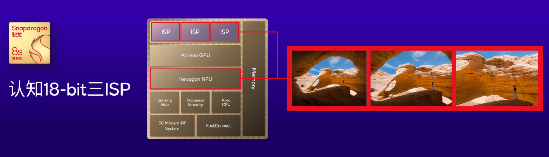 骁龙8s Gen3 跟骁龙8 Gen3 一样,拥有认知 18-bit 三 ISP,每秒能处理数十亿像素的海量数据,18-bit ISP 相比起传统的 14-bit ISP,能捕捉的影像数据直接提升了四千多倍,可以给画面带来极致的动态范围和色彩表现。